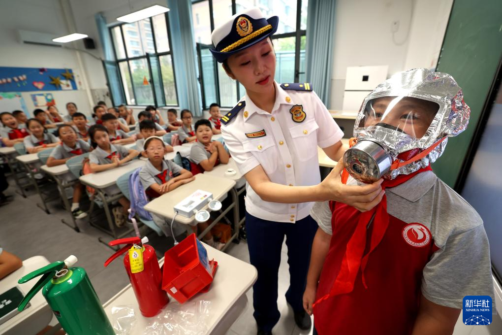 9月1日,在河北省石家庄市友谊大街小学开学第一课上,消防队员为学生讲解消防防护面具使用方法。