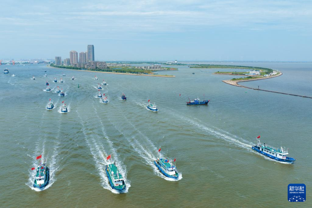 9月1日,渔船驶离山东省日照市岚山区岚山渔港,开展捕捞作业(无人机照片)。