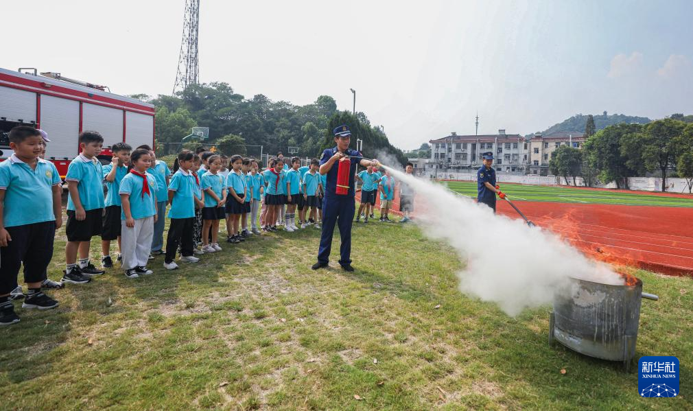 9月2日,东林镇应急消防管理站工作人员给东林小学学生讲解灭火器的正确使用方法。