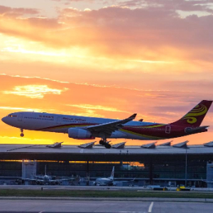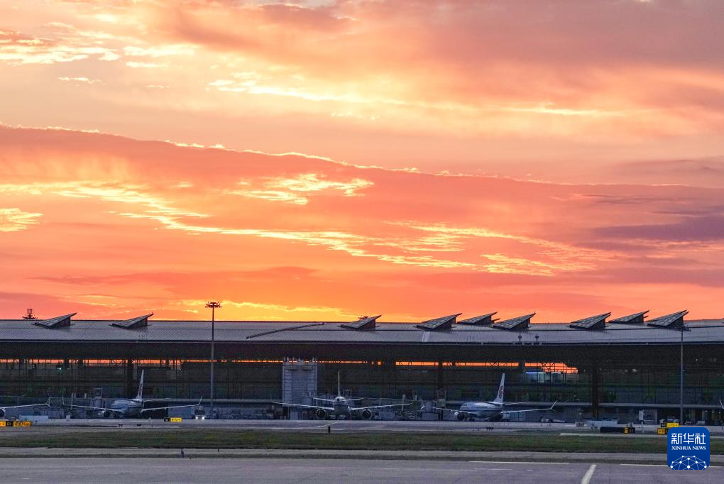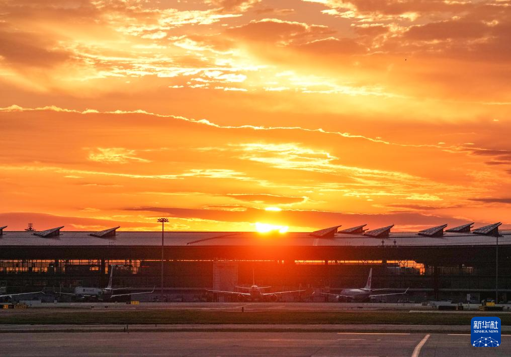 9月2日清晨,一架航班在朝霞下的北京首都国际机场降落。