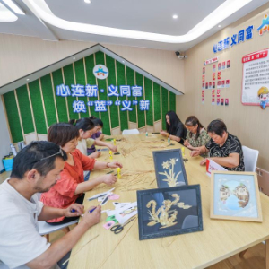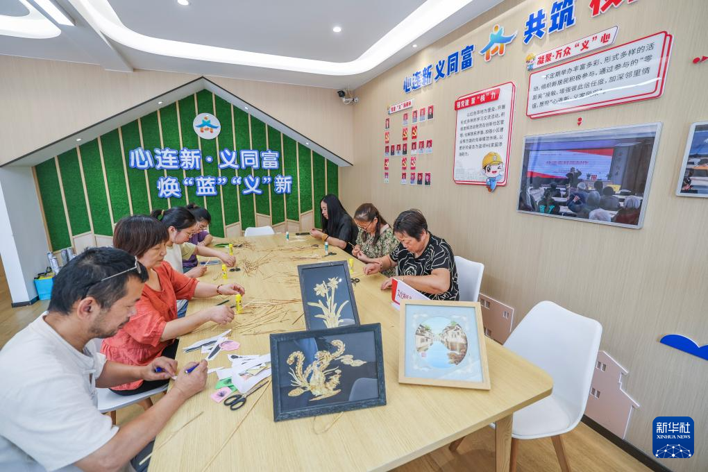 9月4日,在嘉兴市秀洲区高照街道新义村蓝领家园内,文化特派员(左一)开展麦秆画非遗手工制作活动。