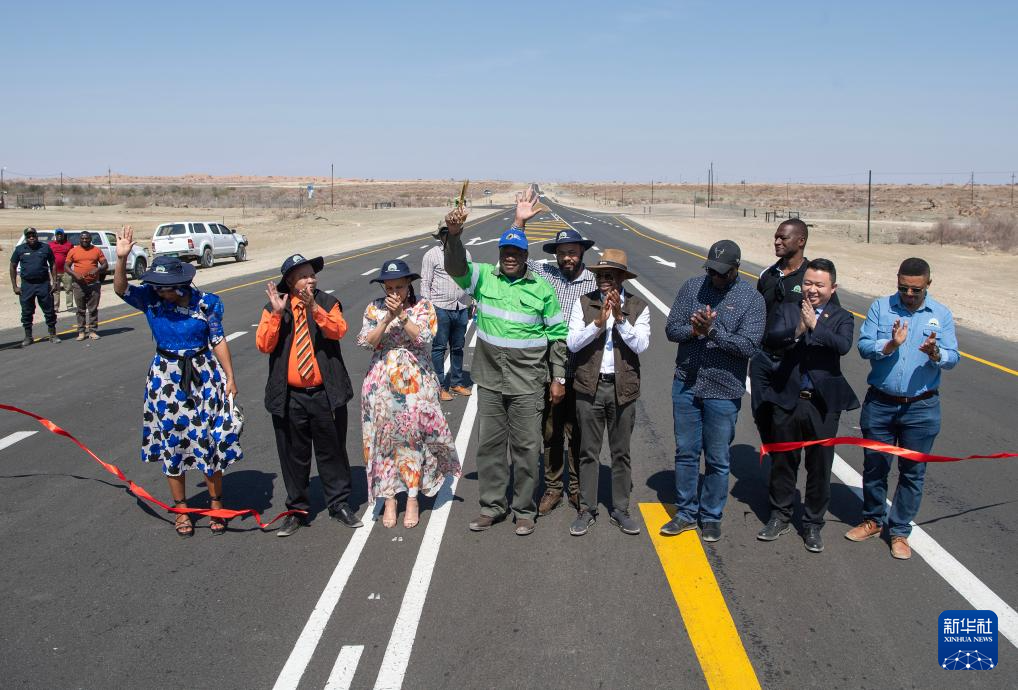 9月3日,在纳米比亚南部城镇策斯,纳米比亚副总理兼工程与运输部长穆托尔瓦(前左四)与嘉宾在通车仪式上剪彩。
