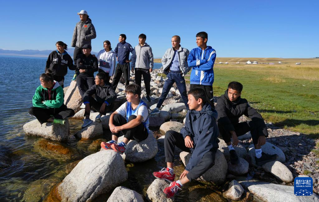 运动员在赛里木湖畔进行野外训练(8月31日摄)。