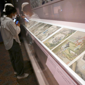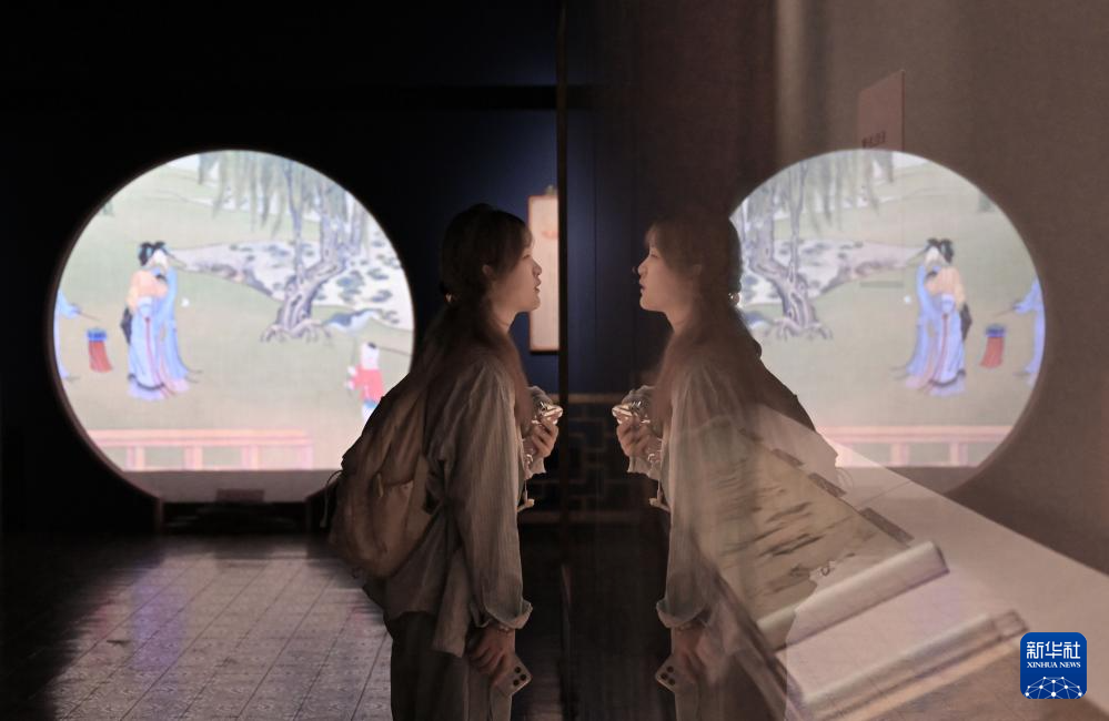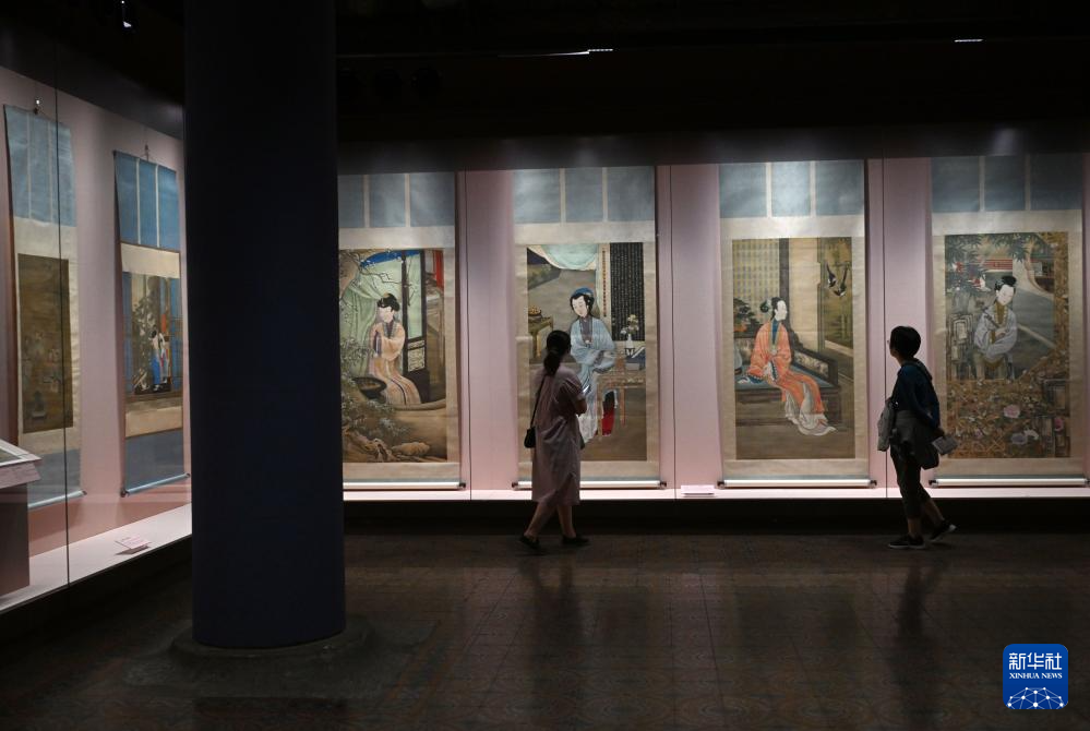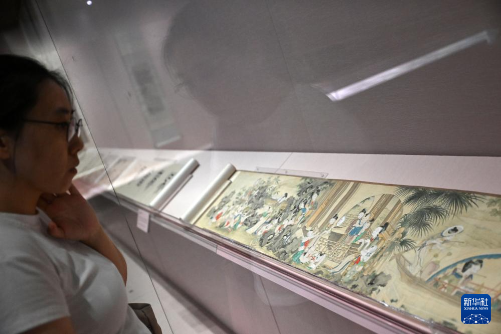 9月4日,参观者在北京故宫博物院观看月曼清游图册。