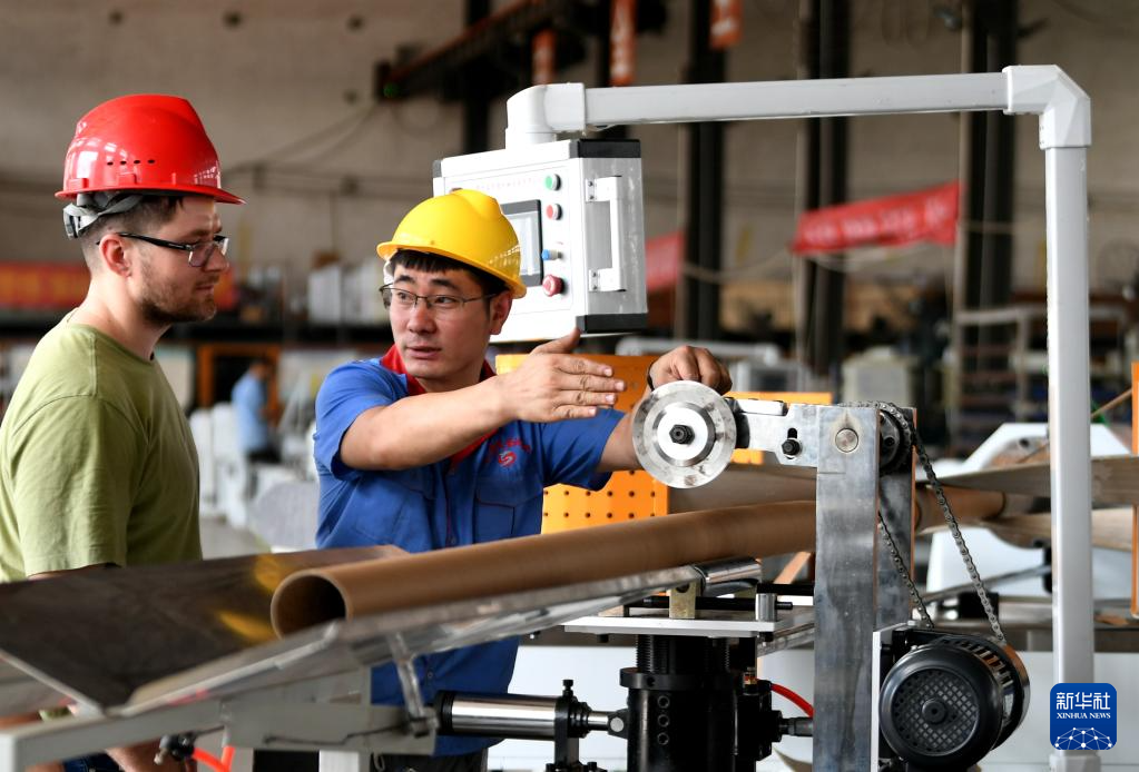 9月4日,在阜城县码头镇一家包装机械制造企业生产车间,工人向外国客商介绍产品。