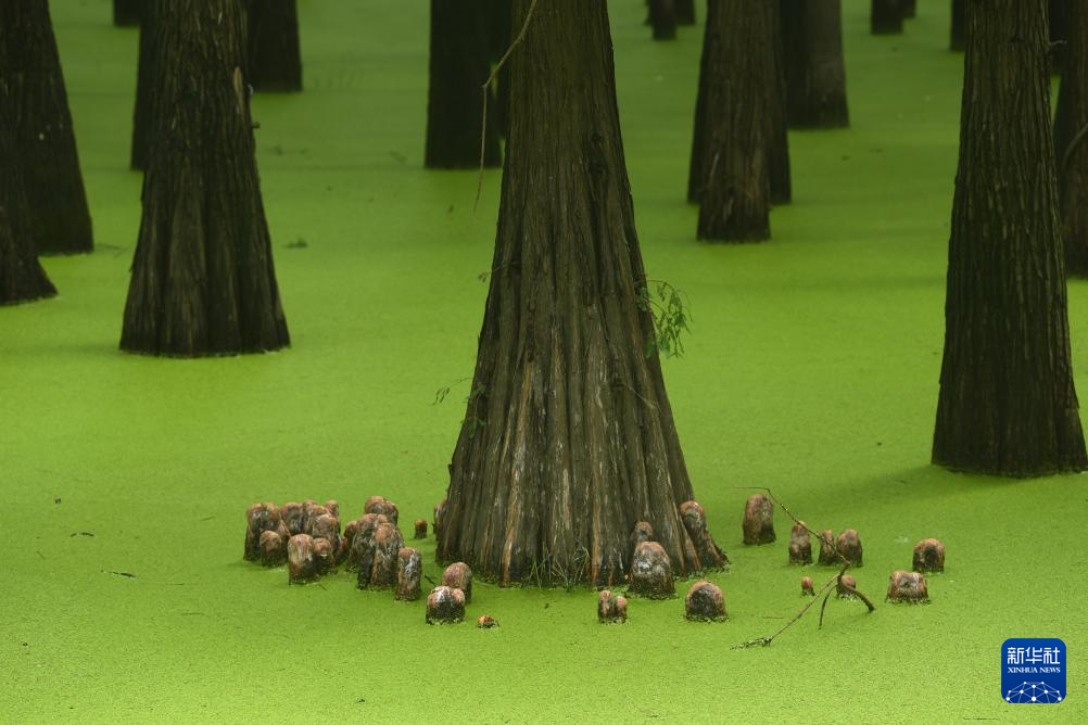 这是水上森林中杉树伸出水面的呼吸根(9月4日摄)。
