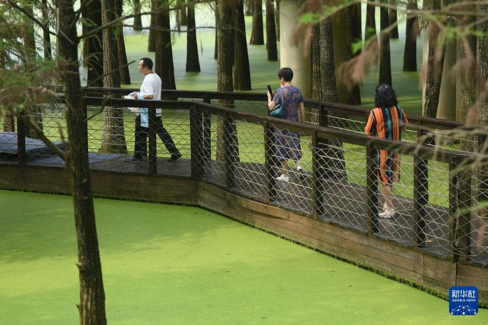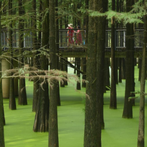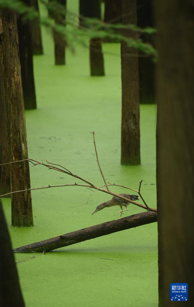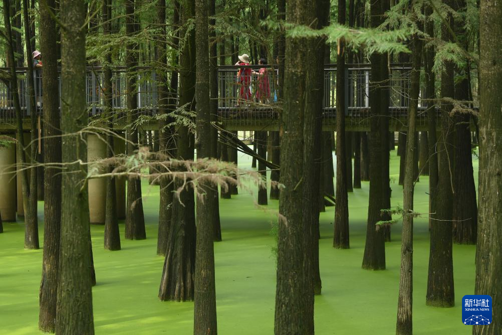 初秋时节,杭州青山湖水上森林近百亩池杉、落羽杉和水面的浮萍相映成趣,呈现出幽静的生态景观。