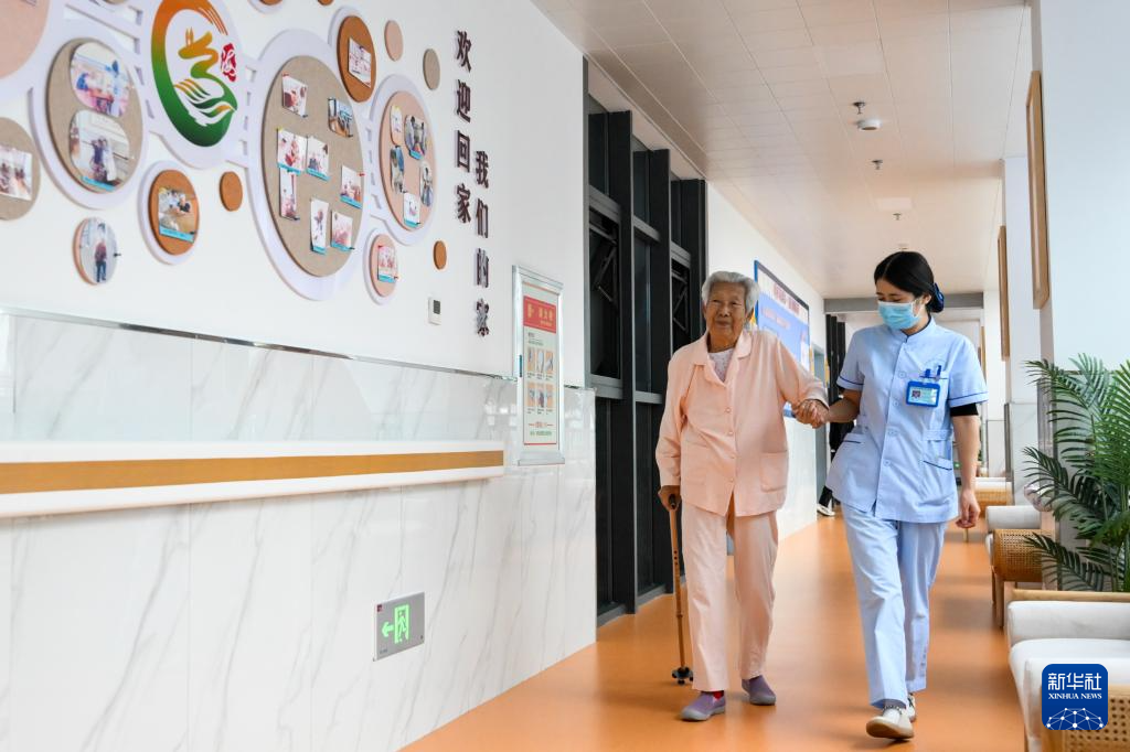 9月4日,一名老年人(左)走在乌海市海南区养老综合服务中心。