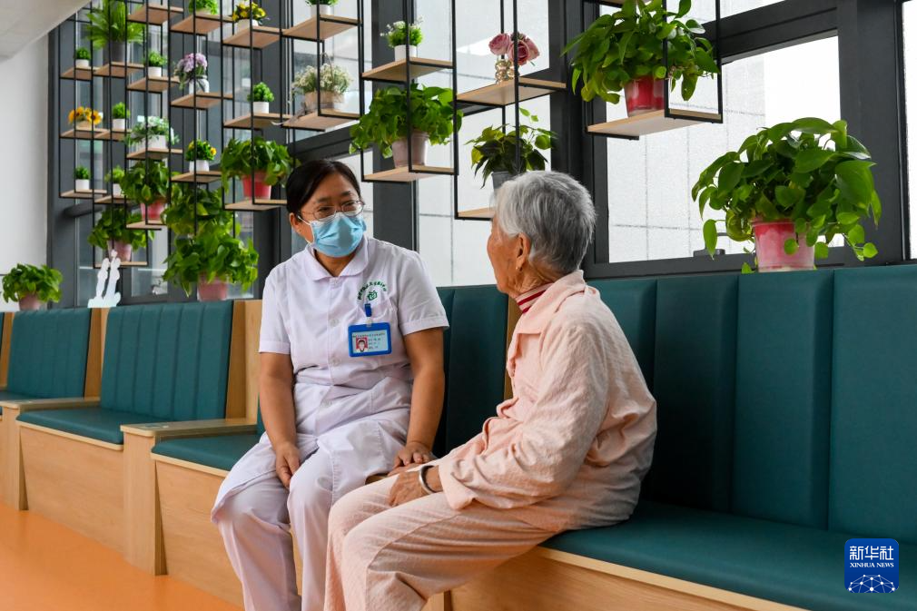 9月4日,医务人员(左)在乌海市海南区养老综合服务中心了解老年人的健康情况。