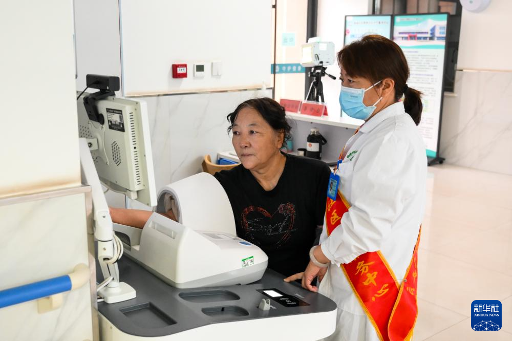 9月4日,一名居民(左)在乌海市海南区拉僧仲社区卫生服务中心测量血压。