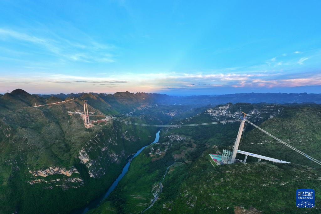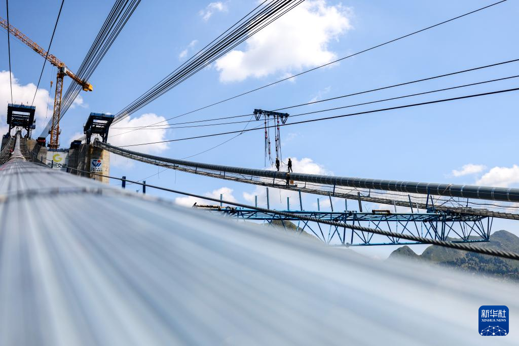 9月4日,建筑工人在花江峡谷大桥的猫道上施工。