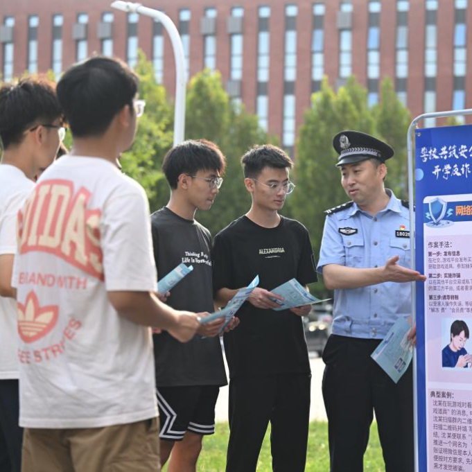 当日,天津市公安局刑侦总队、内保总队在天津大学开展“开学反诈第一课”集中宣传活动。民警通过解析常见网络诈骗种类与手段,向广大师生宣传反诈防骗知识,以提高师生安全防范意识和反诈防骗能力,助力筑牢校园反诈“防火墙”。