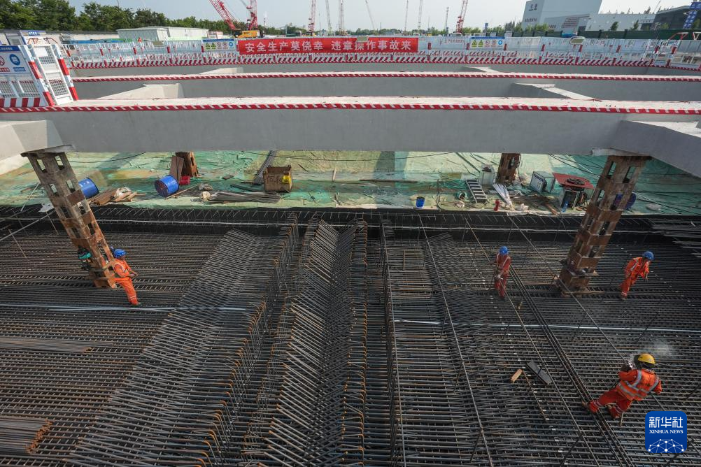 9月4日,工人在海太长江隧道南段作业(无人机照片)。海太长江隧道项目位于苏通大桥下游约8公里,北接南通海门、南连苏州太仓、常熟;起点与G40沪陕高速公路相接,终点与G4221沪武高速公路相接,路线全长39.070公里,其中过江隧道长11.185公里。全线采用双向6车道高速公路标准,设计时速100-120公里。