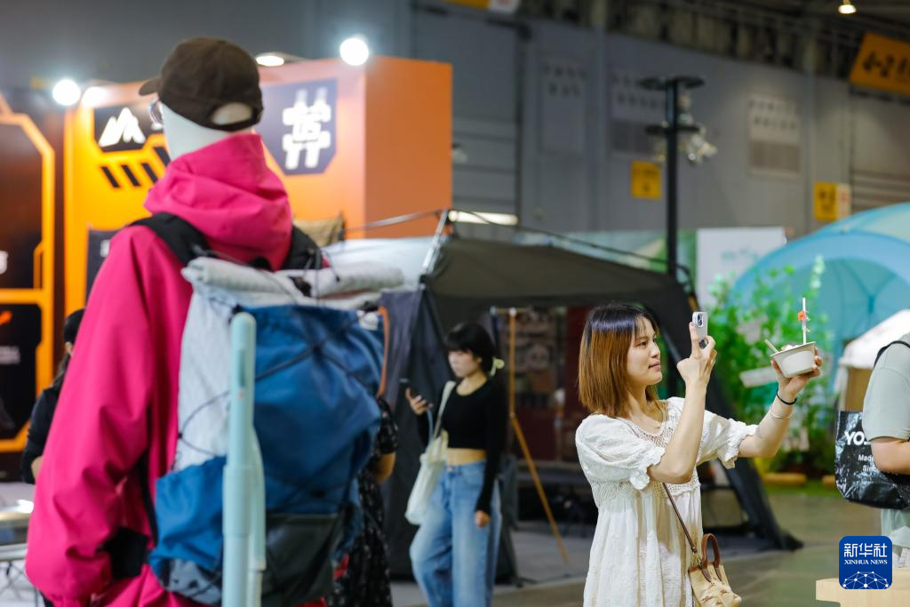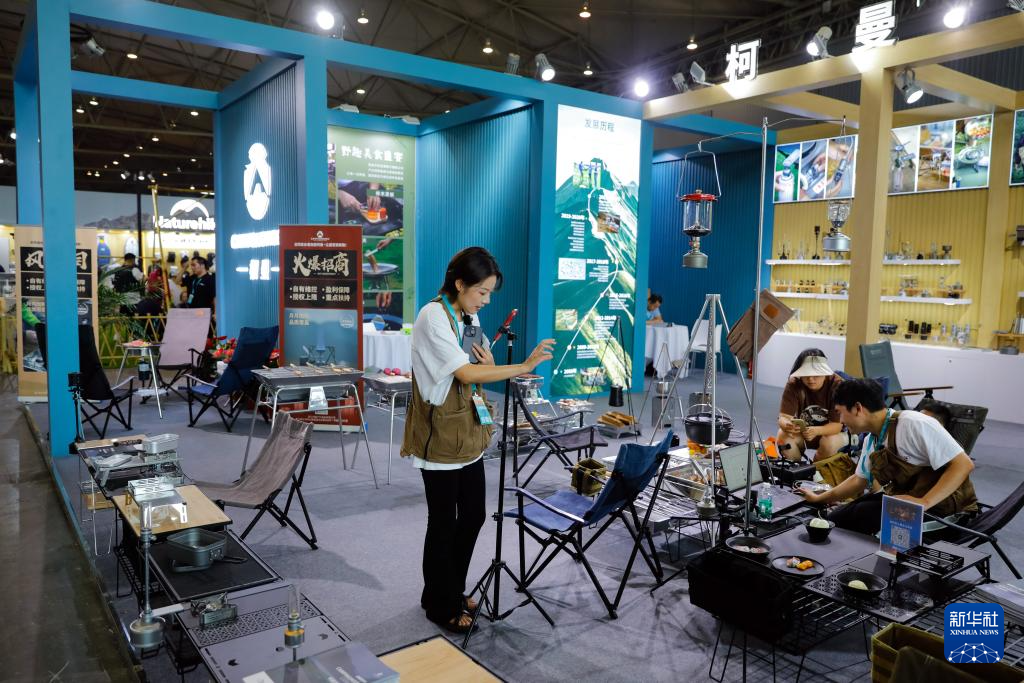 9月6日,在CLE中国(成都)户外露营生活展上,参观者在拍摄户外露营用的帐篷。