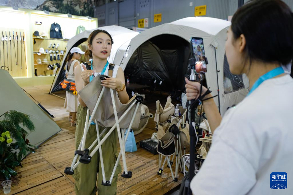 9月6日,在CLE中国(成都)户外露营生活展上,一名直播达人(左)通过互联网直播销售户外露营产品。