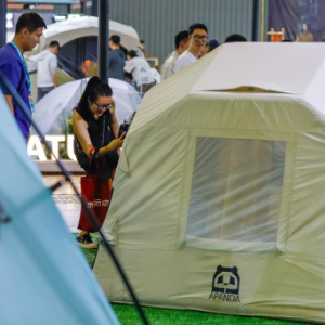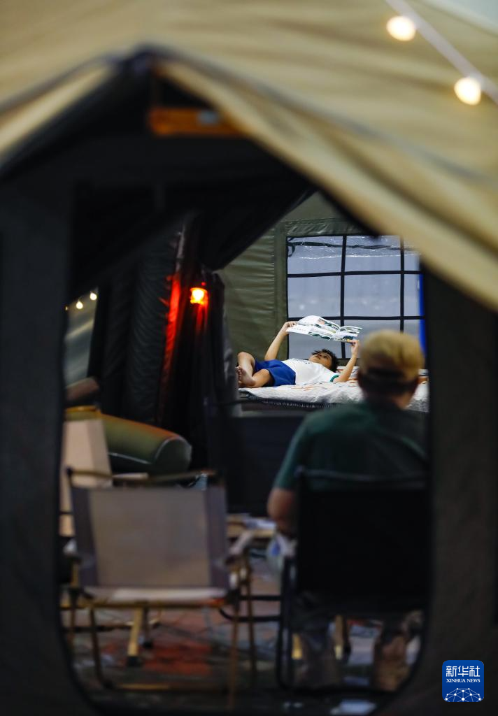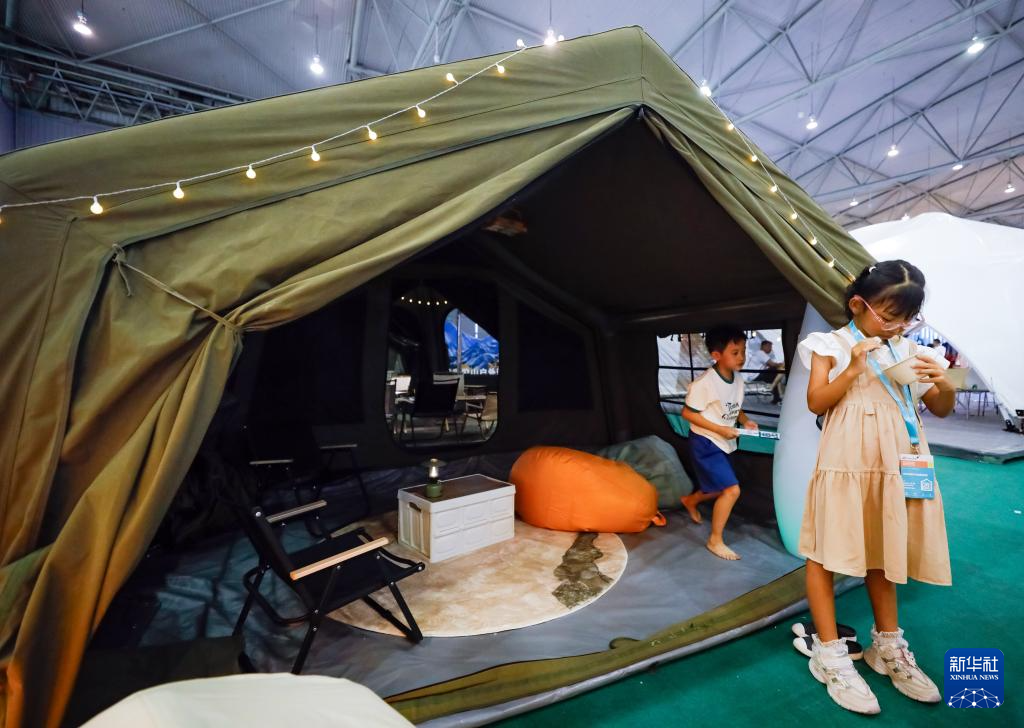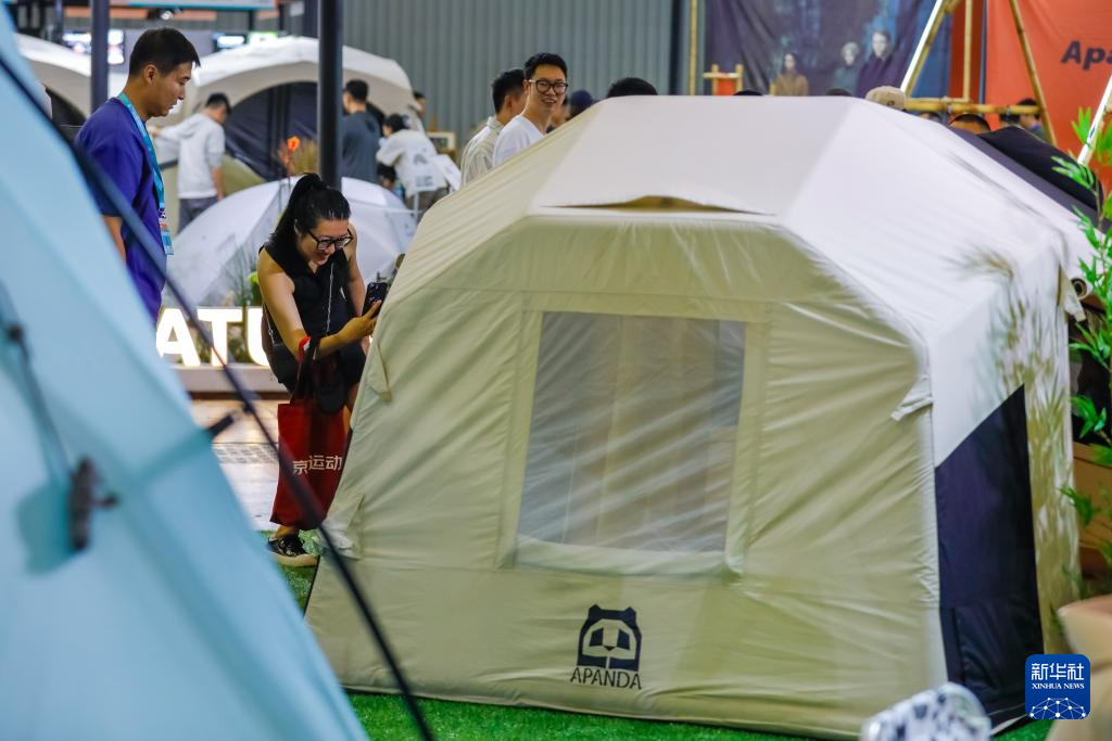 9月6日,在CLE中国(成都)户外露营生活展上,参观者体验户外露营用的帐篷。