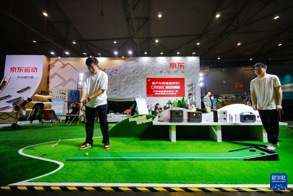 9月6日,在CLE中国(成都)户外露营生活展上,一名参观者在体验迷你高尔夫设备。