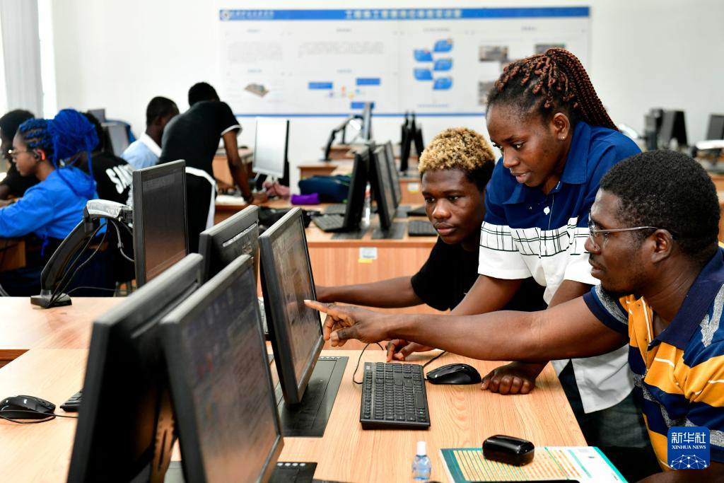 9月5日,在日照职业技术学院智慧建造中心,建筑工程系老师希晓萌(右二)在指导加纳学生进行建筑CAD绘图。