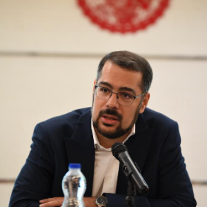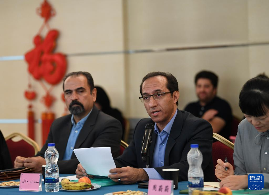 9月3日,在伊朗首都德黑兰,阿拉梅·塔巴塔巴伊大学中国研究中心主任贾拉利(左二)在“中文教学在伊朗”研讨会上发言。