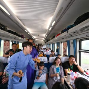 9月7日,相声演员在S910列车上为旅客表演快板。