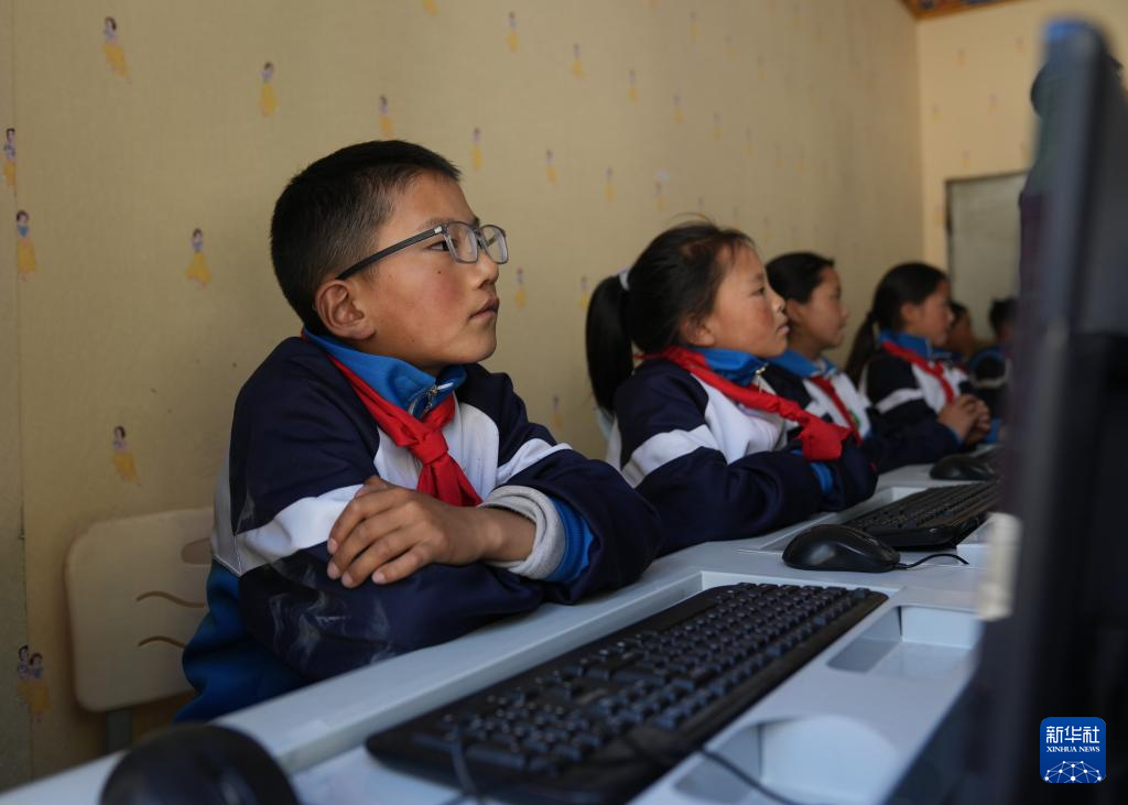 在娘蒲乡中心小学,贡乔热旦在上计算机课(9月3日摄)。