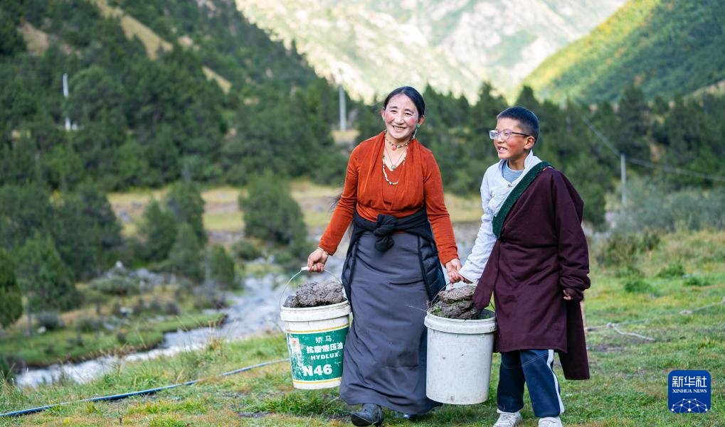 贡乔热旦(右)和母亲阿吉在夏季牧场捡完牛粪“满载而归”(9月4日摄)。