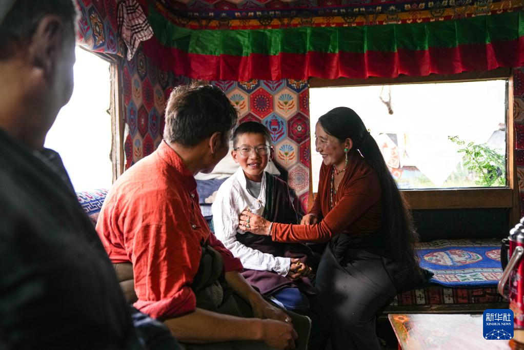 在夏季牧场的房子里,贡乔热旦的母亲阿吉(右一)整理儿子的藏装(9月4日摄)。