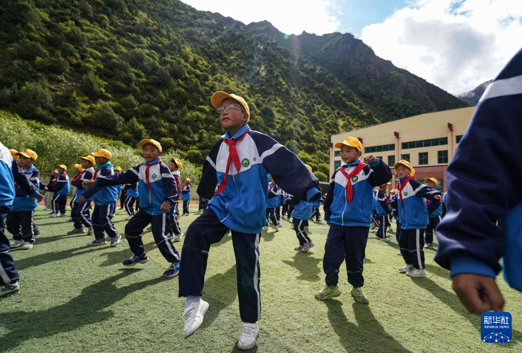 贡乔热旦(中)和同学们在课间跳锅庄舞(9月4日摄)。