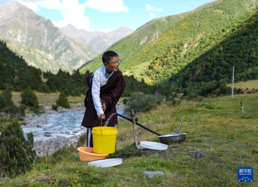 贡乔热旦在夏季牧场帮忙打水(9月4日摄)。