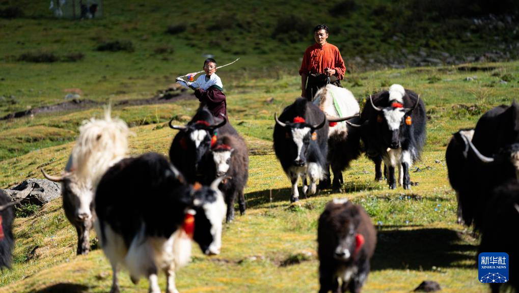 贡乔热旦(左)和父亲王登在自家的夏季牧场放牧(9月4日摄)。