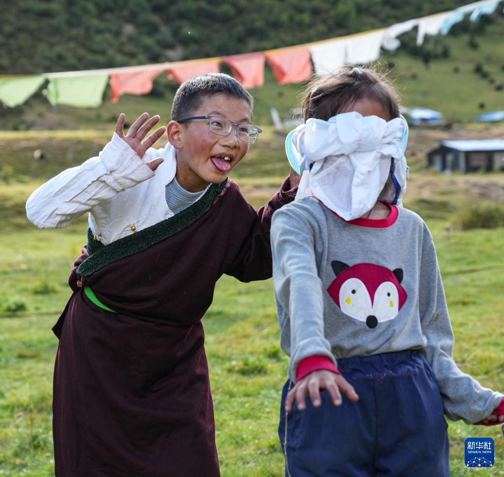贡乔热旦(左)在夏季牧场和表妹玩耍(9月4日摄)。