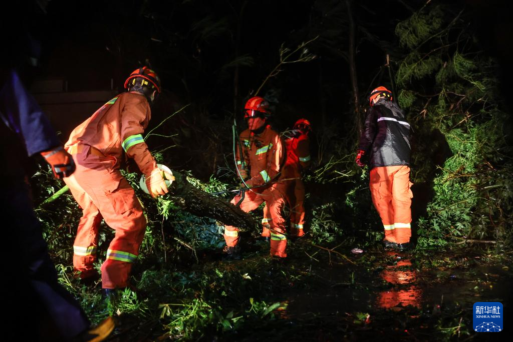 9月6日,在海南文昌市铺前镇,海南消防等应急部门在台风过后的深夜清理路障。