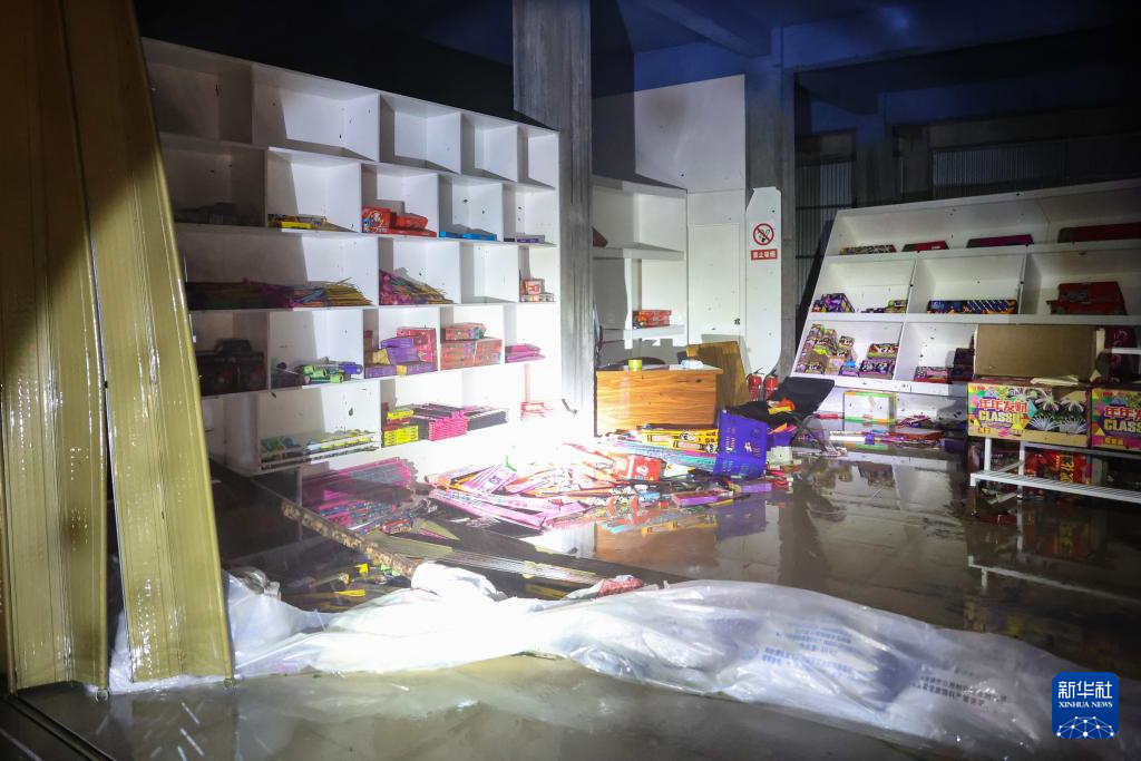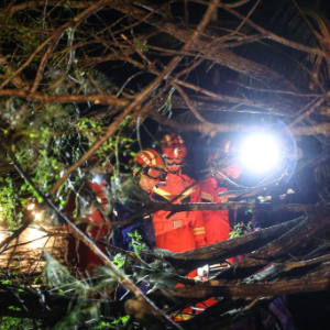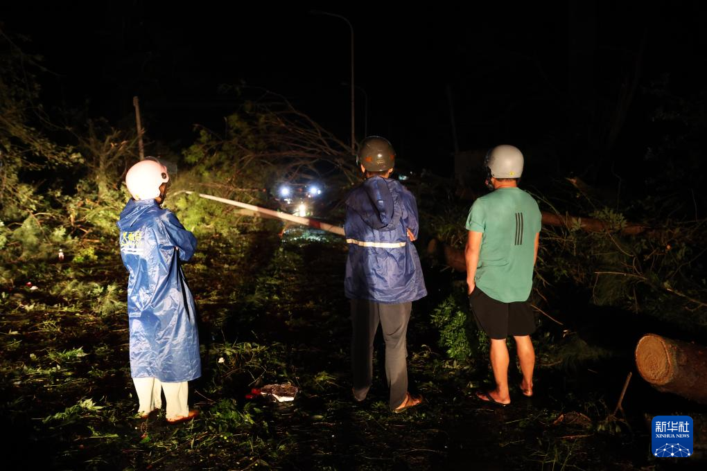9月7日,在海南文昌市铺前镇,海南消防等应急部门在台风过后的深夜清理路障。