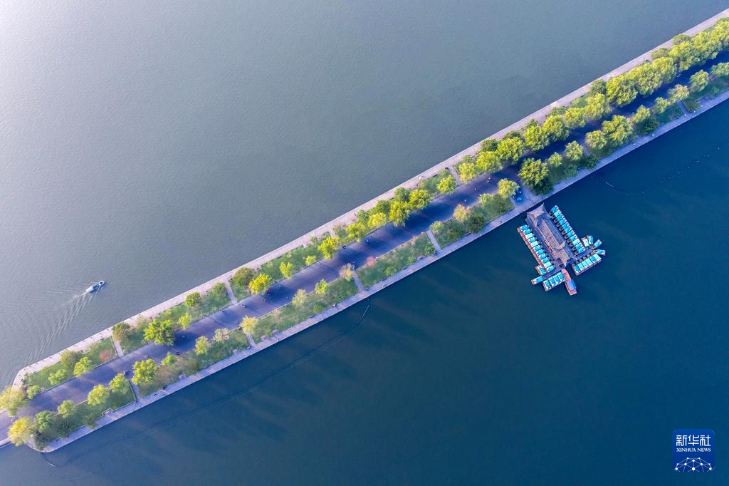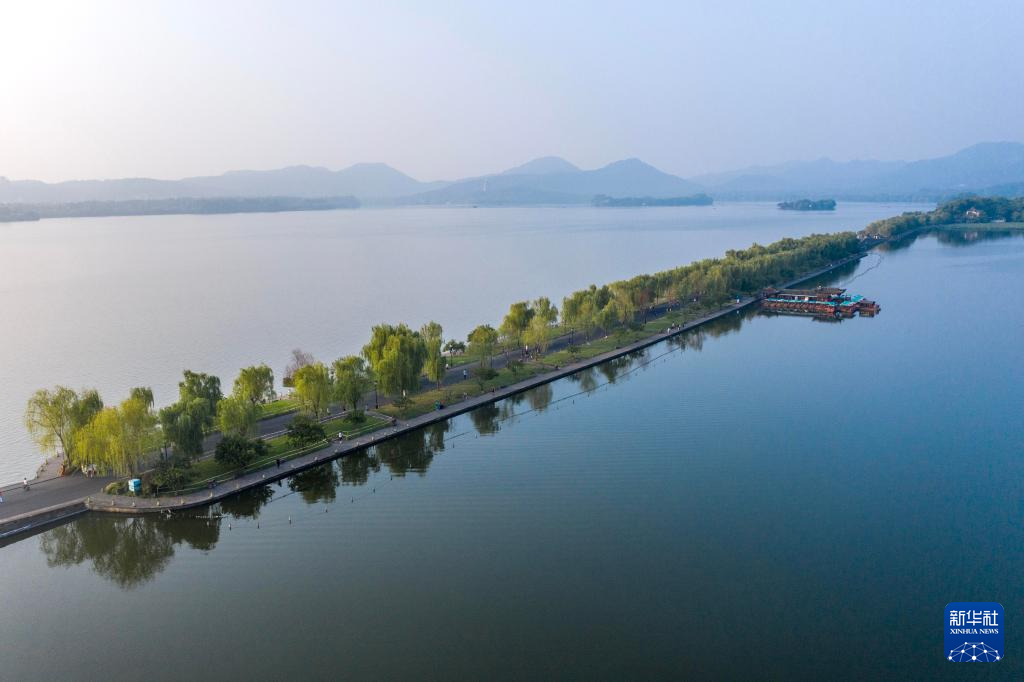 晨曦中的杭州西湖白堤(9月7日摄,无人机照片)。