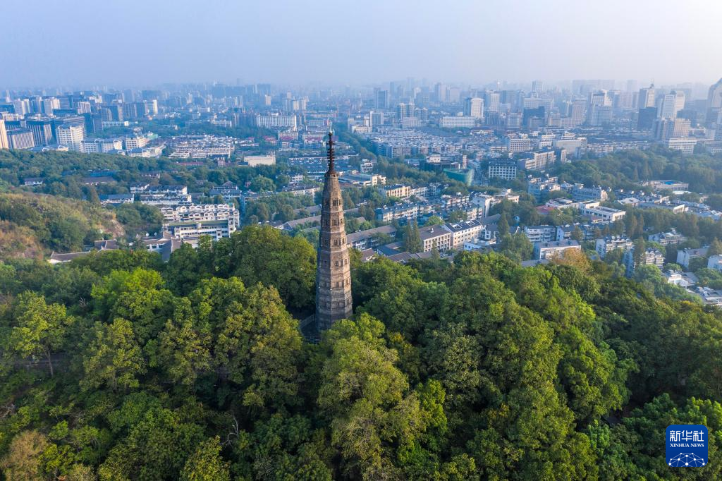 9月7日拍摄的晨曦中杭州西湖边的保俶塔(无人机照片)。