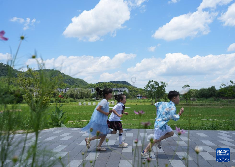 儿童在余姚市梁弄镇的田野间奔跑(7月3日摄)。