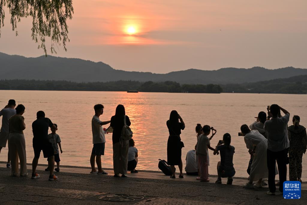 游客在杭州西湖边欣赏落日(8月9日摄)。