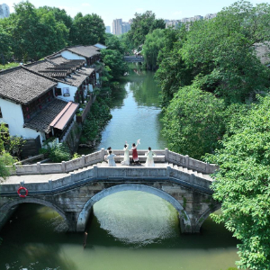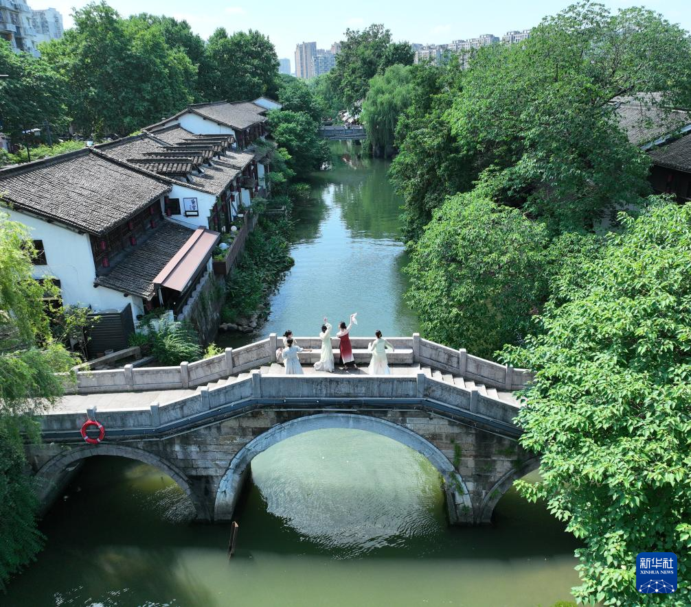 汉服爱好者在杭州小河直街留影(6月12日摄,无人机照片)。