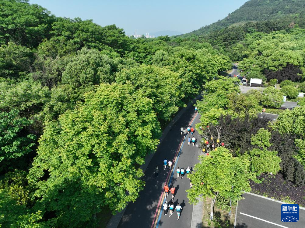 市民在湖州市中心一个公园进行晨跑(5月18日摄,无人机照片)。
