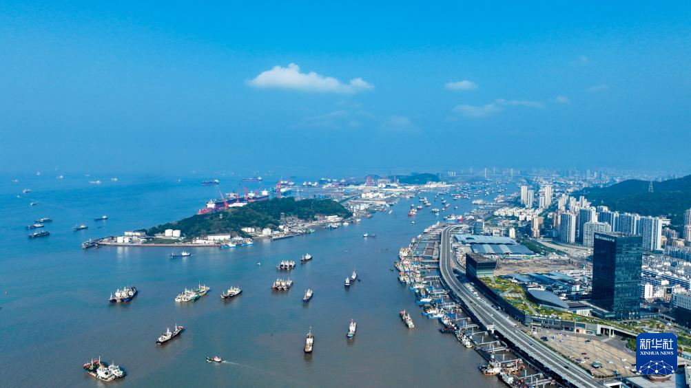 9月7日,浙江省舟山市普陀区沈家门渔港内船只往来穿行(无人机照片)。
