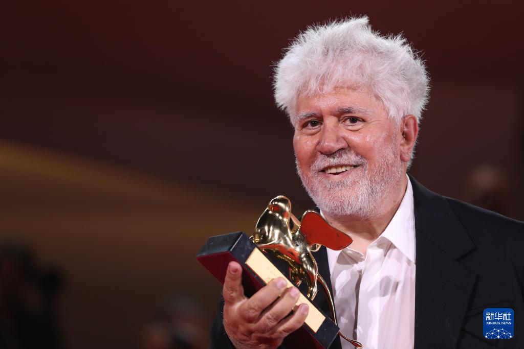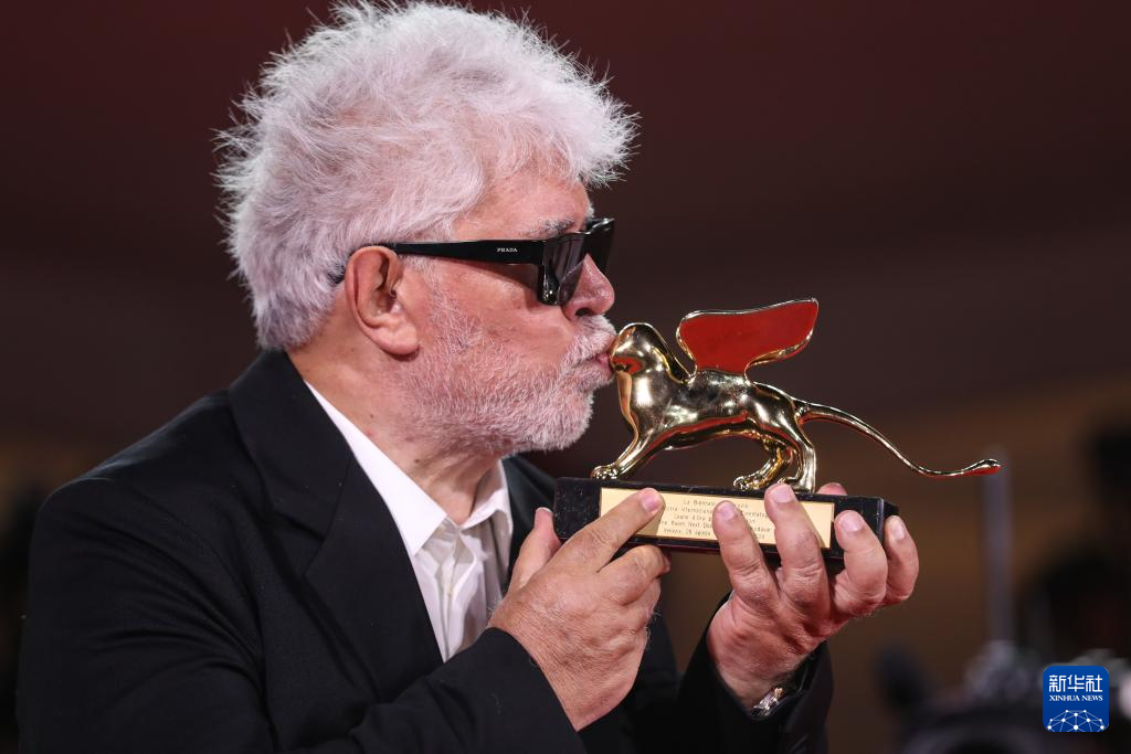 9月7日,在意大利威尼斯,凭借影片《隔壁房间》获得最佳影片金狮奖的西班牙导演佩德罗·阿莫多瓦与金狮奖杯合影。