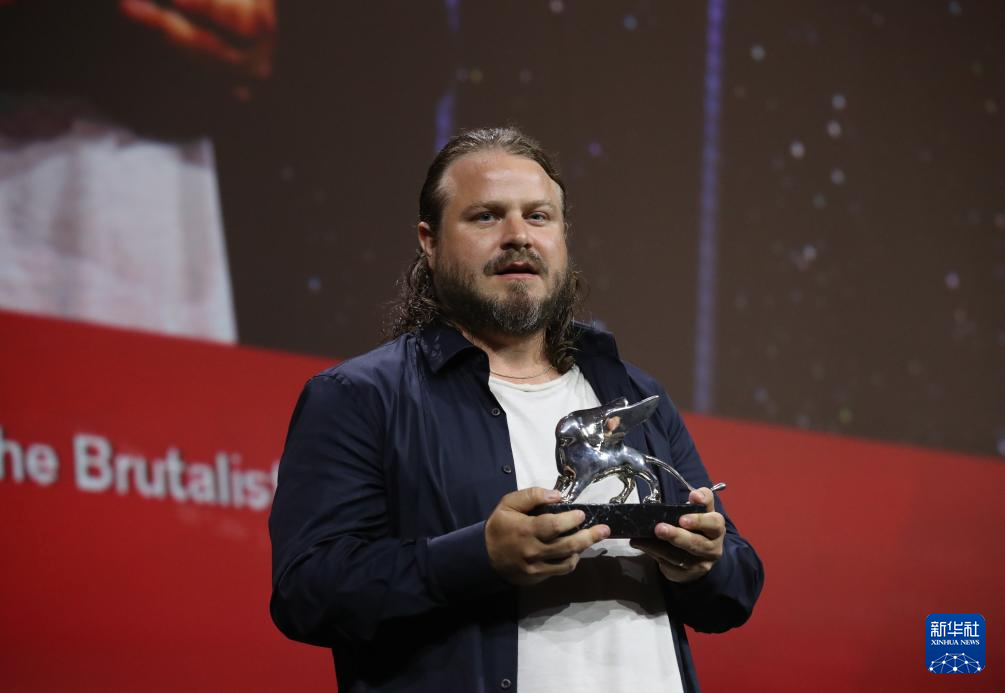 9月7日,在意大利威尼斯,凭借影片《野兽派》获得最佳导演奖的美国导演布雷迪·科比特与奖杯合影。