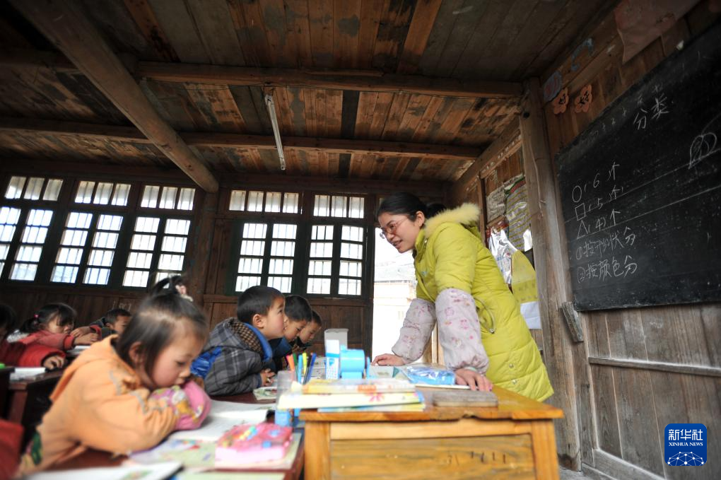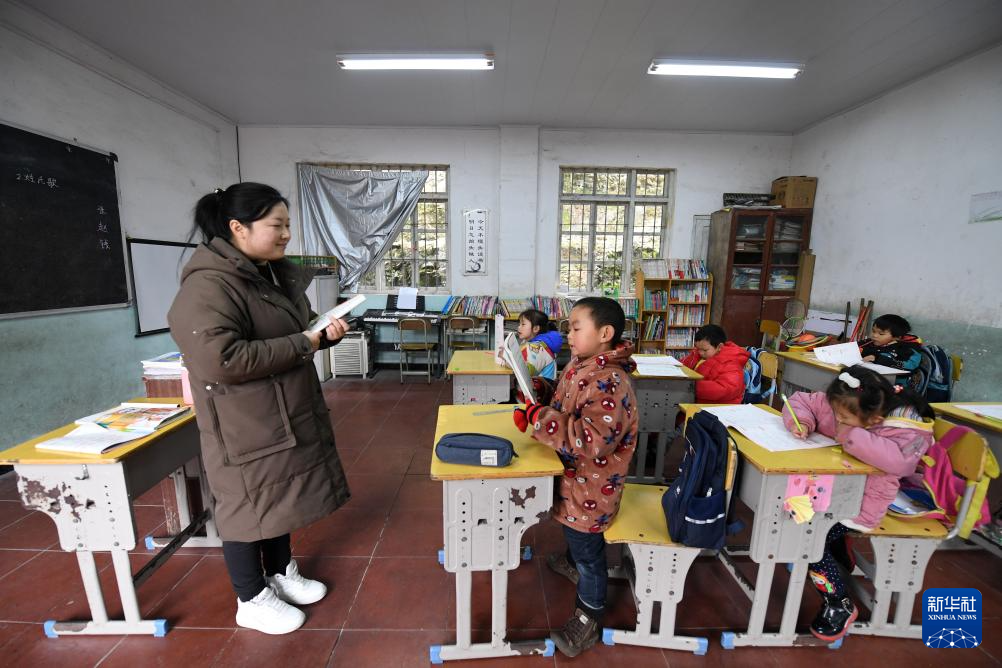 在广西灵川县兰田瑶族乡东良教学点,“85后”老师石夏月给学生上课(2022年2月24日摄)。