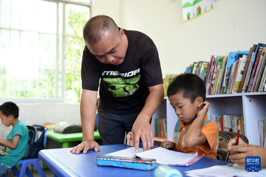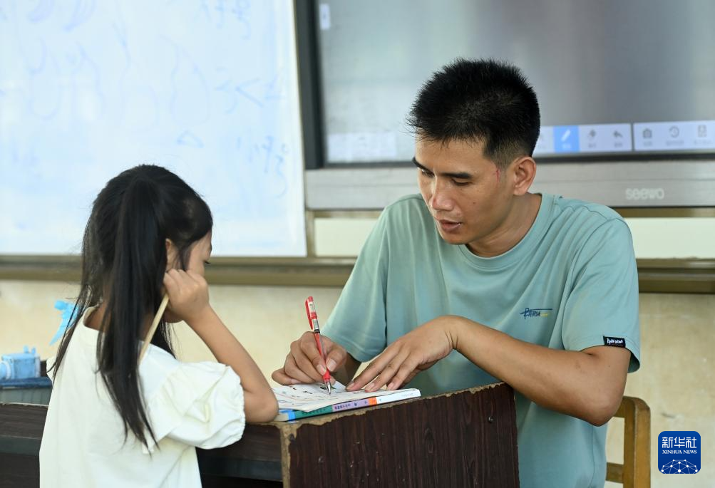 在广西南宁市邕宁区中和镇中心学校周禄教学点,“90后”老师何海香指导学生完成课堂作业(2024年9月4日摄)。