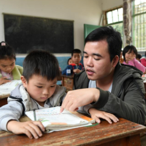 在广西天等县龙茗镇东南村烟屯教学点,“80后”老师董祥在辅导学生功课(2015年6月23日摄)。