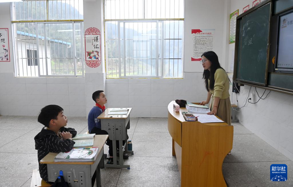 在广西灌阳县洞井瑶族乡野猪殿小学,“95后”老师赵艳在给学生上课(3月27日摄)。