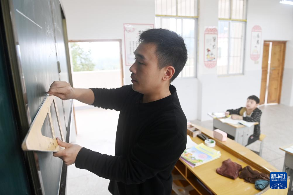 在广西灌阳县洞井瑶族乡野猪殿小学,“85后”老师李清东在给学生上课(2024年3月27日摄)。