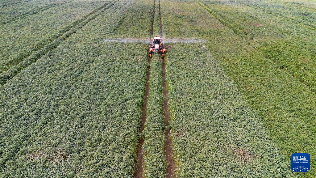 9月9日,在新疆生产建设兵团第一师阿拉尔市十一团花桥镇,农民驾驶农机为棉花喷洒脱叶剂。该地块共128亩,由种植户韩帮儿、高银芳和陈志林共同承包。