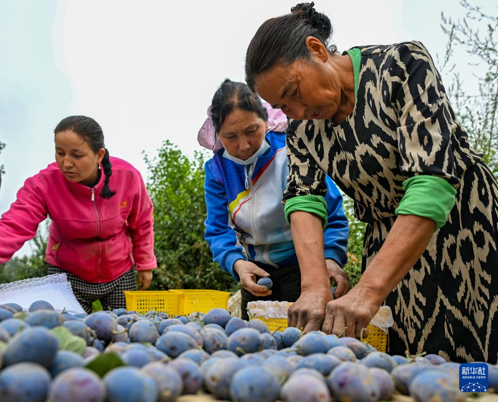 9月4日,新疆生产建设兵团第十四师昆玉市七十四团老兵镇种植户在挑选和打包刚刚采摘的西梅。