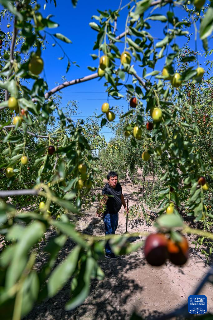 9月8日,新疆生产建设兵团第三师图木舒克市四十九团海安镇种植户买明·米吉提在红枣地里劳作。他种植了25亩红枣。